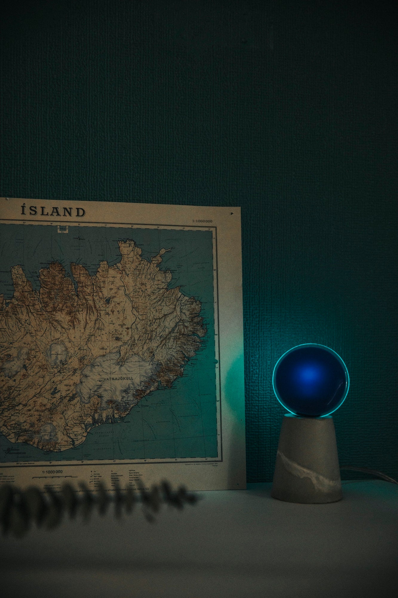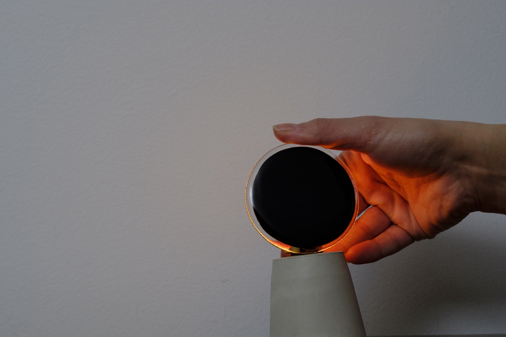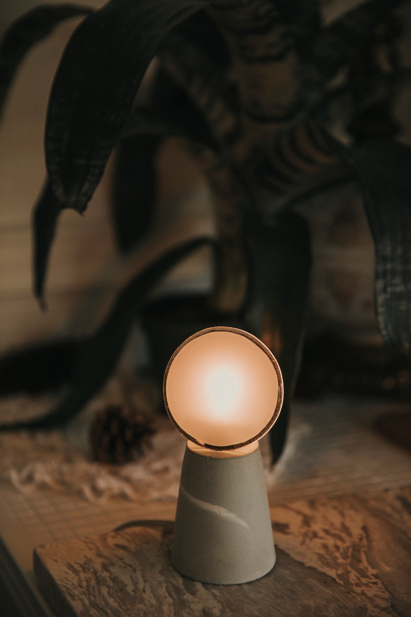 The light passes through the glass, settles on the mineral material, then diffuses gently into the space.